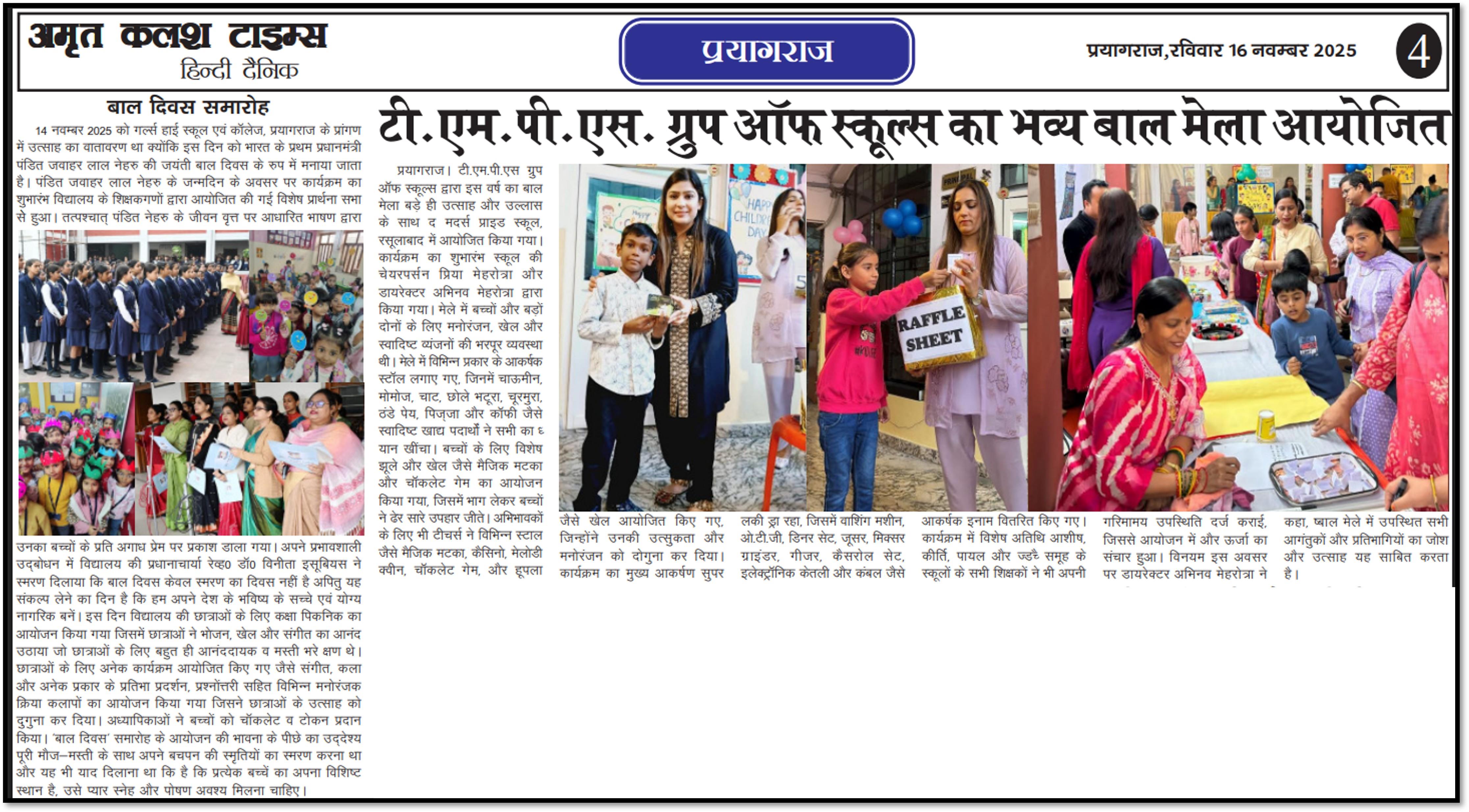 The newspaper article highlights a Children's Day celebration organized by the T.M.P.S. Group of Schools in Prayagraj on November 14, 2025. The event featured various activities and was aimed at honoring children while promoting a sense of joy and camaraderie. The celebrations included a parade with students showing love and respect for their teachers and school, along with cultural performances. A special children's fair was also held, where students participated in games, raffles, and other fun activities. Teachers were actively involved in engaging the children, while the atmosphere was filled with excitement and enthusiasm. The event served as a platform for fostering a positive and supportive environment for the children, making them feel cherished and special.